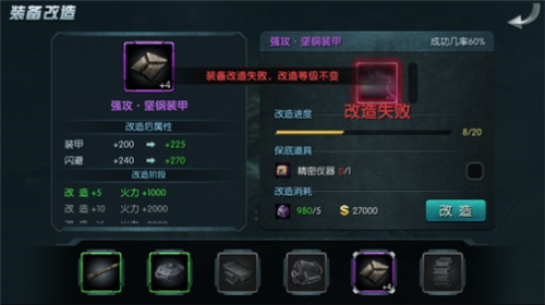装备改造时,成功率是随着改造等级的提升而降低的,因此会发生失败的概率,并且失败后有可能会造成改造等级下降。对于高改造等级装备的再次改造,我们建议玩家使用改造的保底道具——精密仪器,它可以确保改造失败后改造等级不降低。精密仪器在商城有售,同时完成每日任务的玩家可以从奖励中获得。