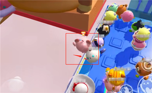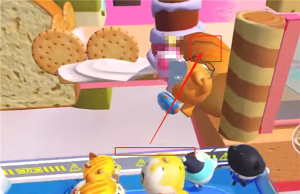 1、同样地在比赛开始前跳到护栏,然后等靠近草莓蛋糕柱时趁机跳到边缘