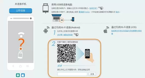 1、连接方式多样:USB数据线、扫描二维码或输入验证码轻松实现手机与电脑连接