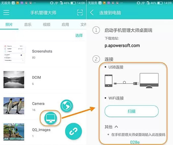 方式二: 点击软件右上角的扫描按键,扫描该软件桌面端界面上的二维码,就可以建立连接。或者点击右下角的链接标识,点一下电脑图标,按一下“扫描”也是一样的。