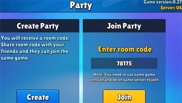 4、点击右侧PARTY进入多人模式,可以创建房间,也可以输入好友的房间代码加入房间;