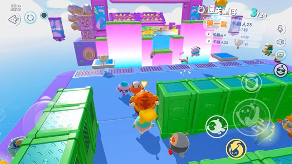 2、来到蓝色风扇障碍的时只需要正常躲避就行了,跳上平台的时有个台阶上有道具可以捡,使用道具还能淘汰其他蛋仔。
