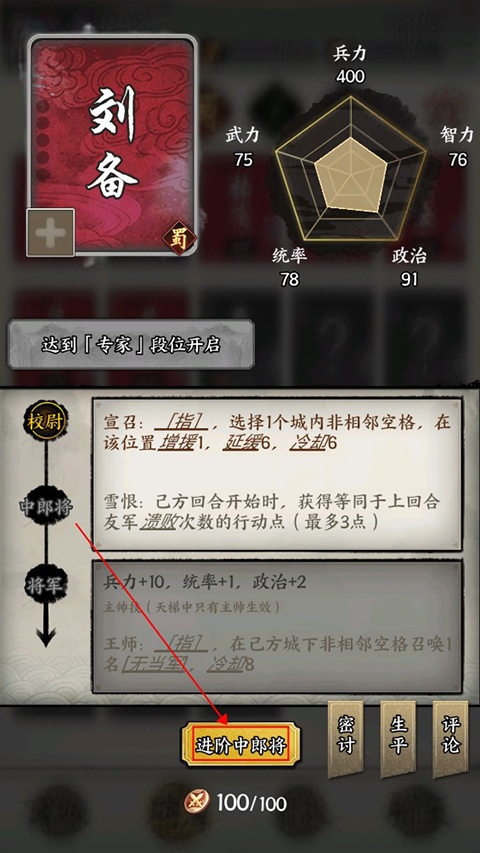 2、玩家还可以对已拥有的武将英雄进行进阶,提高武将阶级,解锁更多技能。