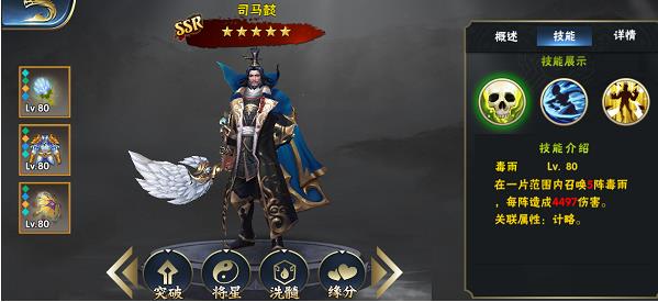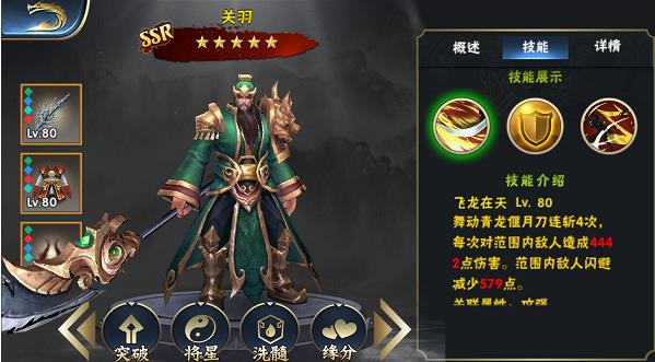 关羽是这款游戏最能看出你的游戏时长的英雄,因为关羽的将星很难到达极致,也是将星配法最多的SSR英雄,将星的配法一会再说先说一下关羽的属性。关羽只有一技能有攻强的加成其他技能并没有加成,所以武器和法宝也只能选择攻强加成。护甲是唯一一个需要考虑的装备。护甲的加成属性要和将星的保持一致,才能使加成到达最高。