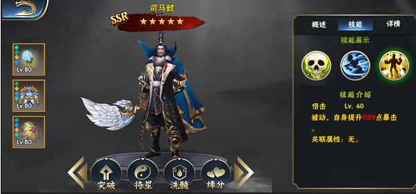 3.若武将已拥有,点击该武将可以进入单个武将的属性页面。可以观看当前武将属性以及对武将的一些提升(详细见武将属性面板操作)