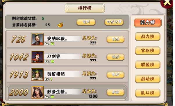点击“排行榜”按钮可以进入排行榜界面,可以当前实力榜,战力榜,官职榜,联盟榜,战功榜,乱斗榜。而且可以直接挑战实力榜实力靠前的对手