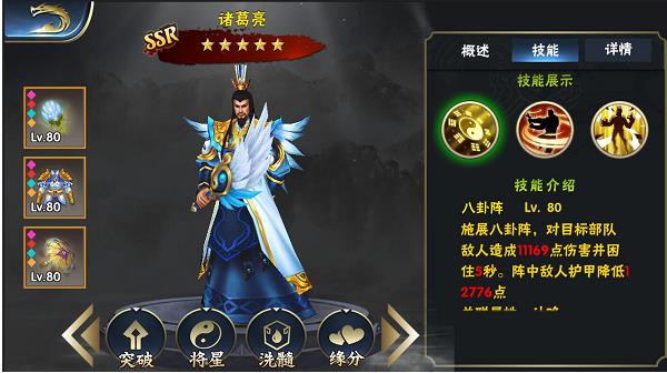 诸葛亮三国第一智囊,鲁迅先生更是以“诸葛亮多智而近妖”来评价诸葛亮的才智,这并不是一句贬义词而是鲁迅对诸葛亮智慧的肯定,在横扫三将军中诸葛亮也是一个能力超强的武将,更是有那一分“兴周八百年之姜子牙,旺汉四百年之张子房”的那种智算通天的感觉。首先双被动普通而又平常可是加的是诸葛亮最需要的属性,《横扫三军》加自身属性和加部队属性的被动不在少数,但是能够匹配到最需要的属性的不足二分之一,如果有两个加属性的被动,那能全部匹配的更是凤毛麟角。有人说诸葛亮是辅助,因为诸葛亮减护甲的作用要比那诸葛亮的技能伤害的作用高很多,可是如果说诸葛亮是辅助那就有点小看了诸葛亮,诸葛亮两个被动技能所加的伤害是不可小觑的。我们一个一个解释一下诸葛亮的技能。