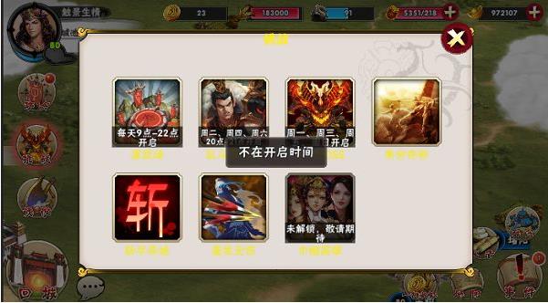 四、挑战则为每日的活动达到固定的时间进行挑战,根据排名或者积分领取相对应的奖励。如果不在对应的时间段内则不可以进行挑战,例如演武场只有在每天的9点到22点开启,世界BOSS只有在周一,周三,周五,周日开启。有的挑战没有时间限制但会根据一些特定的条件来判断获得奖励的多少例如整份夺秒(根据通关的时间),毫发无伤(根据击杀全部敌人后自身武将存活)