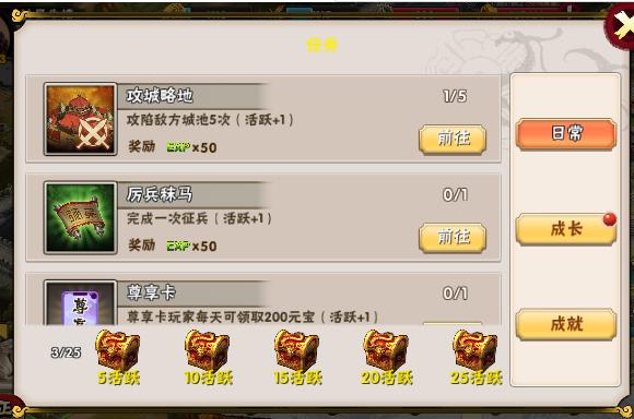 点击“任务”按钮可以进入任务界面,查看当前的日常任务和成长任务