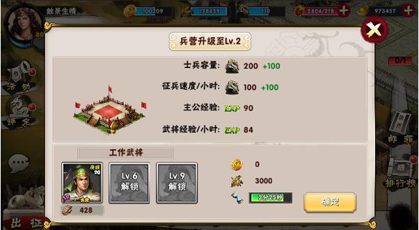 1.兵营可以进行征兵是储存兵力也就是你在外征战的基本保障,通过升级兵营可以提升征兵速度和士兵容量