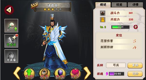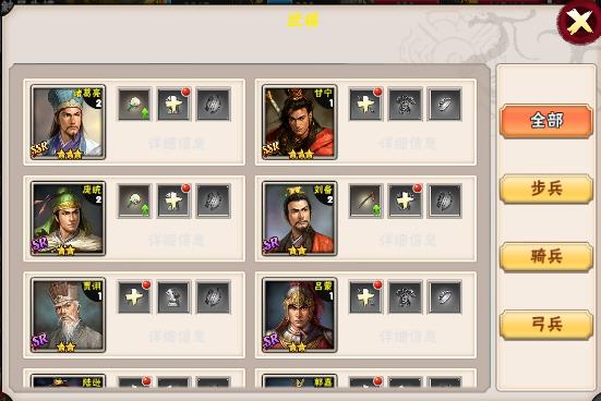 1.点击“武将”按钮,会弹出武将属性界面,可以看到所有已经拥有或未拥有武将,以及武将所对应的兵种