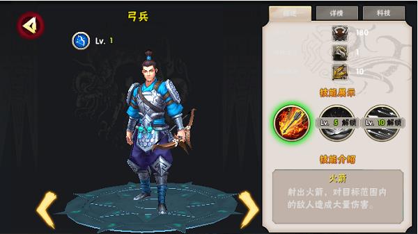 2.点击已经解锁的兵种可以查看该兵种的属性及其技能