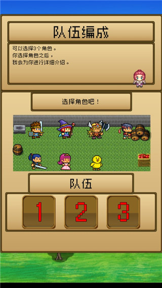 1、进入游戏后,通过一段对话后就可以开始组建队伍,建议选择第一排前三个,勇者、战士、魔法师,能打能抗。