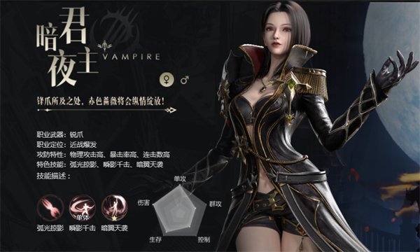 4、最后要说的是暗夜月影之王,来自永夜的高贵贵族,他的爪子所过之处,所有的玫瑰都会绽放!如此华丽的评价,让所有人都感受到了黑暗之王的无限魅力。本职业以利爪为职业,以近身攻击为主,以强大的物理伤害和连招攻击敌人,职业特点是:高伤害,高伤害,是副本之王。攻守兼备,物理攻击高,暴击多,连击多,还有一个特殊的技能,比如弧光掠影、瞬影千击、暗翼天。