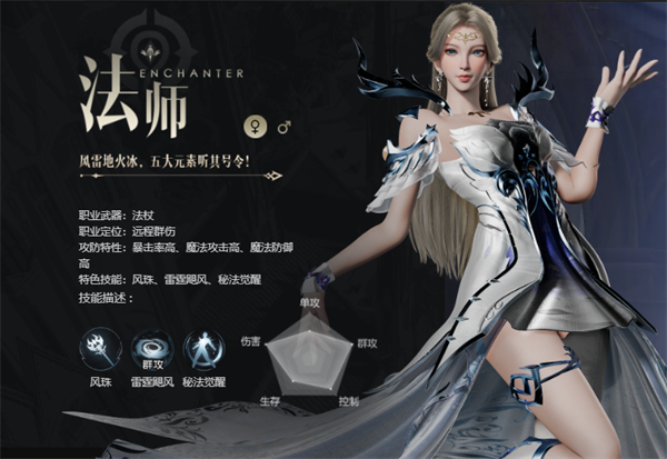 1、游戏里一共有四个职业大家可以选择的,首先给大家介绍介绍法师这个职业吧。法师的魔法伤害是可望而不可及的,他们的远程攻击能力,可以让他们在远程战斗中发挥出最大的威力,无论是在战场上,还是在自己的这一方,都是最好的选择。
