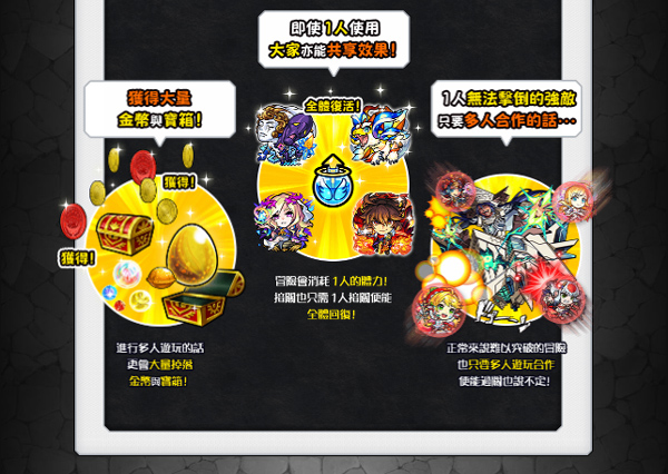 4、进行多人游玩的话会掉落大量金币与宝箱,冒险会消耗一人的精力,开启也只需要一人开启便能全员回复。一人无法击倒的强敌只要多人合作的话,正常来说难以突破的冒险也只需要多人游玩合作,便能过关也说不定;