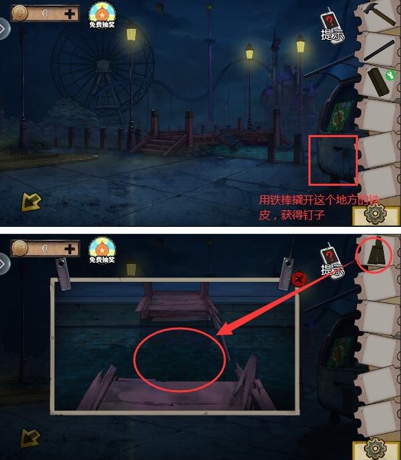 10、用铁棒撬开车皮,获得钉子,将钉子、榔头、木板组合获得钉好的木板,然后就可以修桥了,过桥即可通关。