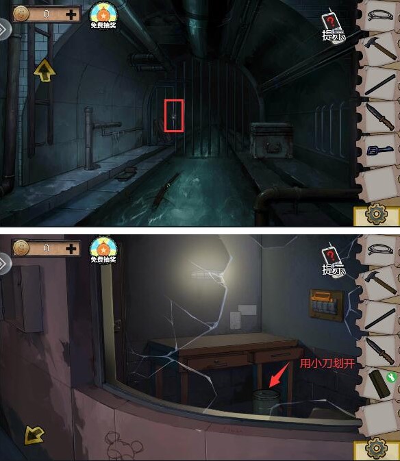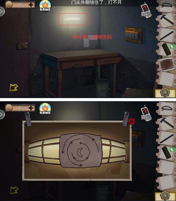 6、回到下水道,用钥匙打开图中的锁,获得木板,然后去警卫室,用小刀划开垃圾桶,使用夹子得到湿纸片,放到警卫室的灯上面烘干,获得下水道密码箱的密码;