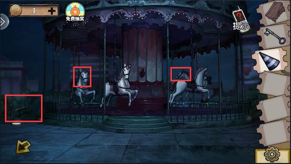 3、在木马嘴里获得钥匙和独角兽的角,左边草丛中的铁棒;