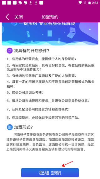 2、在加盟前先了解加盟的条件以及加盟的形式,如果已经具备这些条件后就点击下方蓝色按钮。