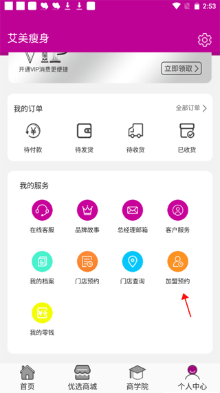 1、进入软件后,选择下方菜单栏“个人中心”,点击我的服务里“加盟预约”。