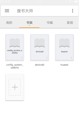 1、首先在手机上打开搜书大师,在书架界面点击“+”号图标;