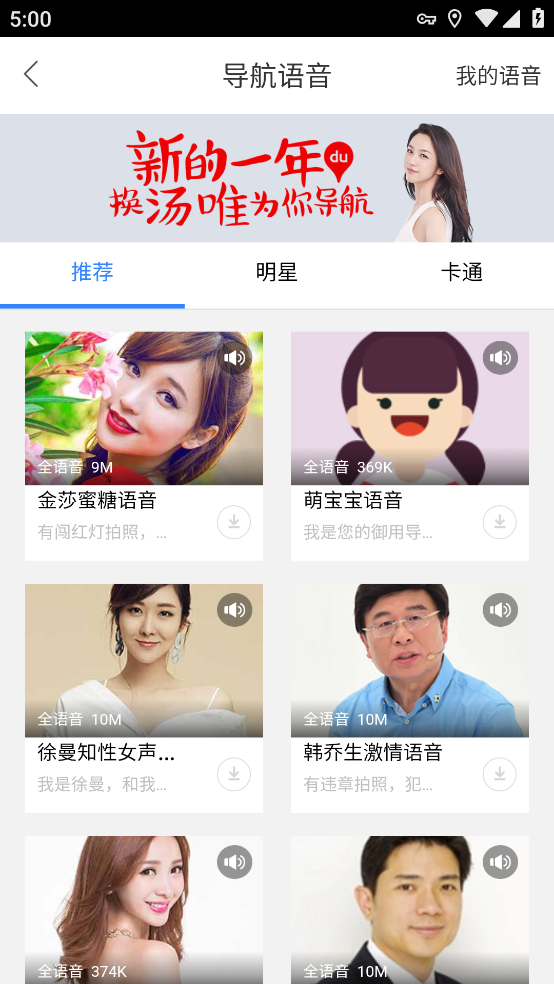 3、多种优美动听的语音都可以在线免费下载,还能点击右上角我的语音查看更换记录