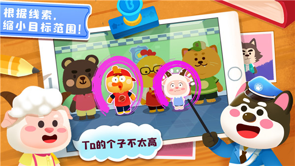 这款游戏真的挺有意思的!它专为4-5岁小朋友设计,主要是通过解谜和搜集线索来培养孩子的动脑能力和思维。游戏里有很多不同的场景关卡,家长可以陪着孩子一起玩,一起探索案情、寻找真相。比如,有一次绵羊宝宝失踪了,孩子需要根据描述画出画像,然后通过监控找到坏人,整个过程特别有趣,还能锻炼孩子的观察力和逻辑推理能力。