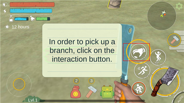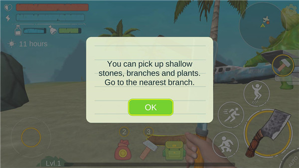 1、下载并安装本站提供的侏罗纪岛屿2最新版打开进入,首先捡一些浅的石头,树枝和植物