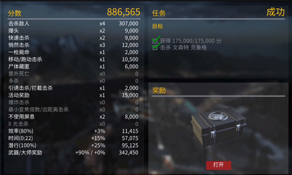 单纯刷分的一个关卡,使用分数加成最高的武器,连续的爆头击杀和秘密击杀,下图是过关的分值结构,枪支使用的是NARCISSUS(6级)。