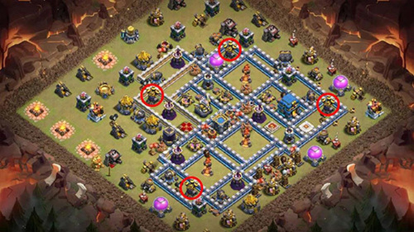 法师塔靠外组成防御链,让蝙蝠的威胁大大降低。大本营用多层城墙包围起来,可以有效分流对方部队,也能起到很好的防御作用。