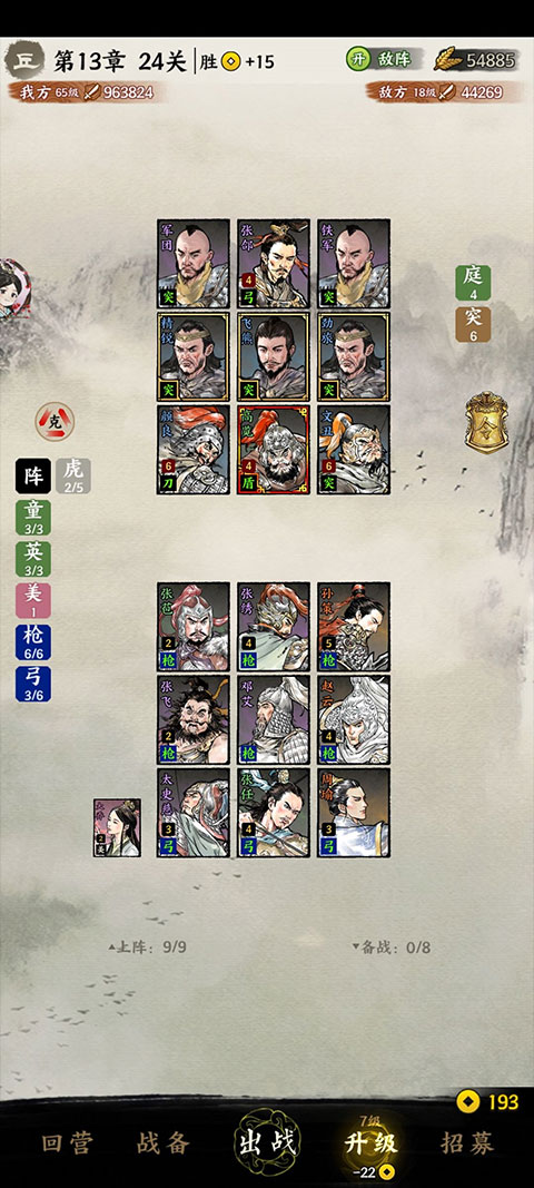 以后续关卡的五子四庭为例。此时阵容难度又上升了一个台阶。阵容中有前排盾兵,中排刀兵,后排三弓。很难找到克制的方法,这也是为何五子四庭被称作前中期完美阵容的原因。此时就应当击其弱点。选择利用没有明显克制关系突骑的高穿透爆发打穿五子四庭。以强攻弱,不让五子有回复的机会。