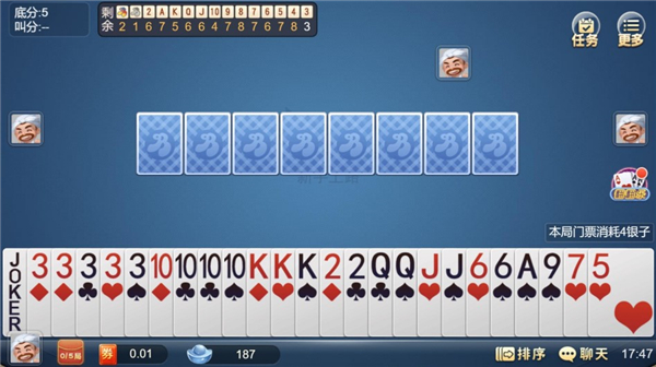 游戏的得分方式也非常简单,每个玩家出完牌后,根据出牌的顺序和出牌的数量来计算得分,如果地主赢了,那么地主可以获得所有玩家的得分,如果地主输了,那么地主需要支付所有玩家的得分,最后,得分最高的玩家获胜。