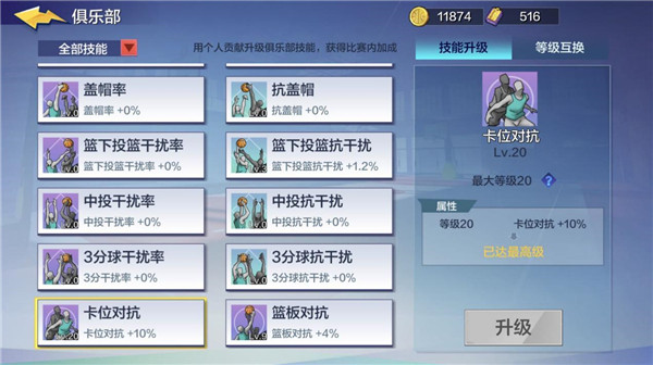 卡位对抗、篮板对抗、盖帽率加满,加满之后是+10%