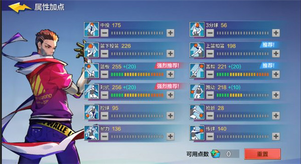 2、除了关键的进攻方面,身体对抗和抢断、盖帽属性也应提升到一个较高的数值。这是因为在1V1模式中一切只能靠自己,强壮的身体能在攻防两端构成威胁,是十分重要的。