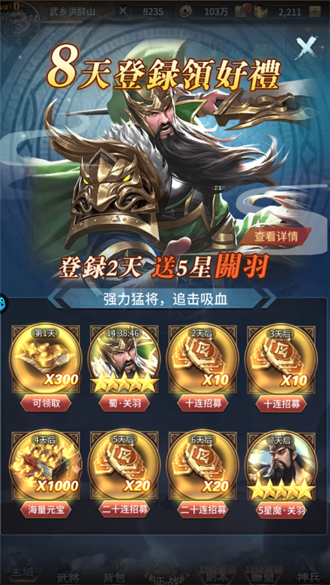 1、下载安装大战国果盘版打开登录,首先我们领取签到礼包,有大量资源;