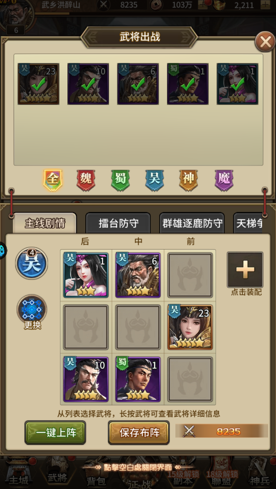 5、点击布阵,可自定义配置不同玩法阵容;