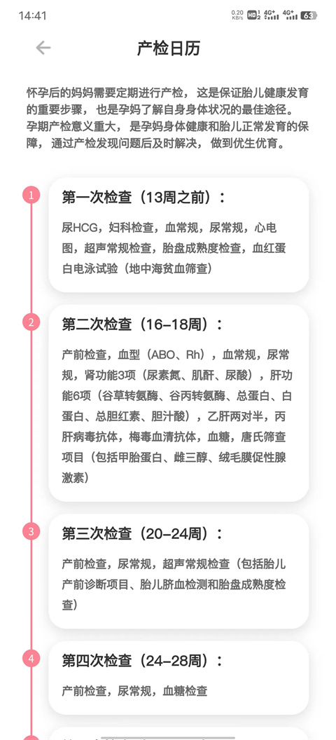 3、产检日历:提示每次产检时间、需要注意事项以及需要检查项目和目的。