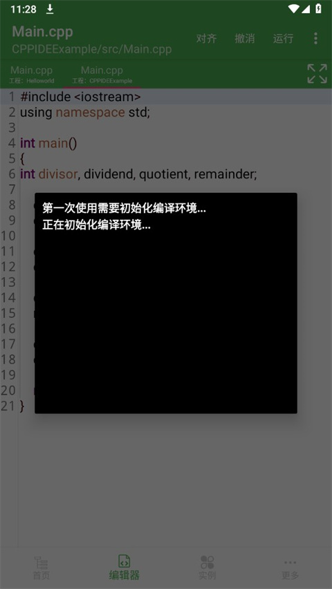 1、下载进入C++编译器IDE手机版,在编辑器页面中,当我们编写了代码之后,点击右上方的运行按钮即可运行代码;