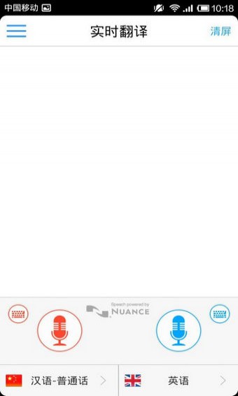 进入首页后,是一个很简单的页面,下面两个麦,上面就是记录屏,麦下方能选择你使用什么语言,右边是翻译的语言,其实这两个功能有点重复。