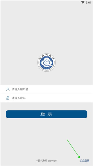 1、在本站下载并安装中国气象局官方版app,进入软件,点击右下角公众登录按钮
