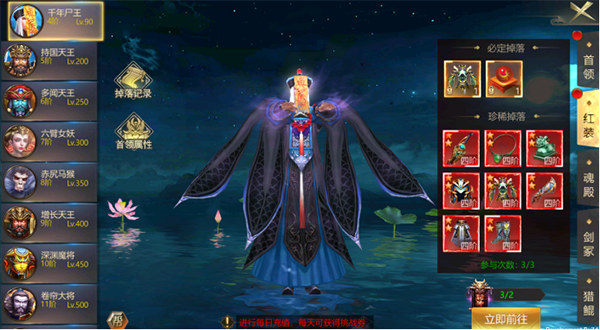红装boss只能单人挑战,概率掉落红装,必定掉落二星橙装和首领经验丹。每天只能参与三次(挑战失败不计如次数哦),需要消耗红装boss挑战券。