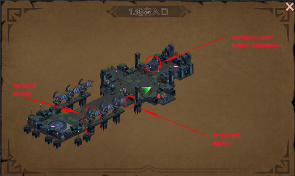2、与雕像对话触发奖励,踩中血迹触发隐藏关卡,击败boss后与墙体对话触发隐藏boss。