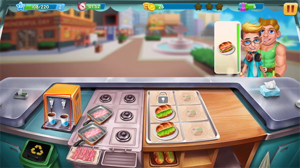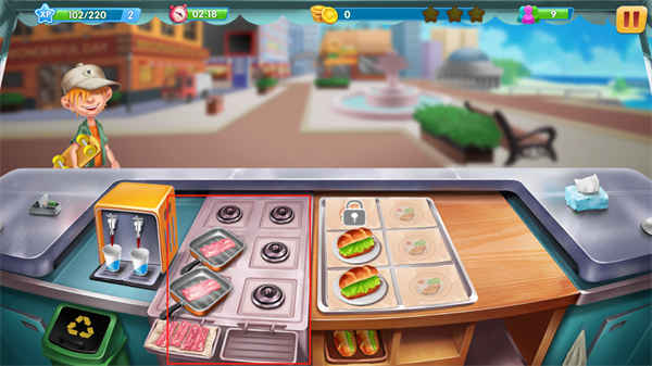新店开张时,我们一开始只有一个培根和鸡排煎锅,因为生意不断创佳,顾客对培根和鸡排的需求增大,加上煎烤耗时比较长,那么只有一个煎锅的话,客人必然会丧失等待的耐心。花费一定的金币或者钻石购买煎锅,就能提高效率了。你的游戏等级越高,后面就能解锁更多的煎锅数量。