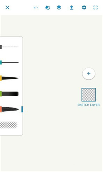 Photoshop Sketch的界面还是很简单易懂的,在左侧可以选择各种笔刷工具,长按的话就能查看所有笔刷工具的列表。如果要调整笔刷的颜色、流量和大小,只要单击笔刷就可以了。Photoshop Sketch的很多操作都比较有意思,例如调节笔刷流量和大小,只要按住相应的位置,然后上下滑动就可以了;又例如长按颜色的位置,就可以拾取颜色等等,用起来还是很顺手的。