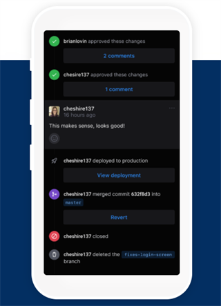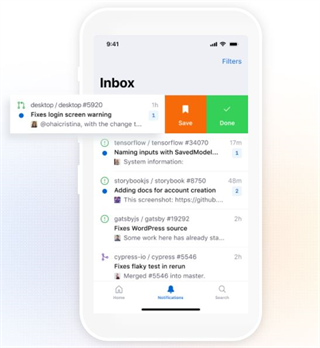 该移动端提供了通知功能,当你被直接@的时候,就能够收到悬浮通知,方便开发者随时随地查看代码、合并更改以及共享协作等。通知会显示在一个类似收件箱的界面上,你可以左滑处理,或保存或标记。