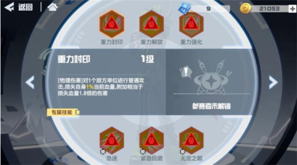 1、专属技能【重力封印】对单体普攻物理伤害,损血1%(1级)附加相当于损失血量1.8倍的伤害。