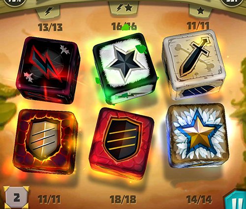 首先整套阵容11骰子猎人进攻属性图标、9骰子猎人防御属性图标、8骰子猎人星属性图标、8骰子猎人电属性图标非常的均衡,本来小编是有用兽人的,但是兽人有一个缺点,就是没有骰子猎人星属性图标骰子猎人电属性图标骰子面,导致到了后面的一些有大量墓碑之类解锁型关卡时,异常卡手,非常难受,还有就是遇到栅栏的时候也是要一阵硬刚,非常不爽,所以骰子猎人星属性图标和骰子猎人电属性图标骰子面的重要性不言而喻。所以选用这套阵容,可以很好的平衡进攻和技能需求,通过锁定来确定下一轮目的,减少碰运气的概率。