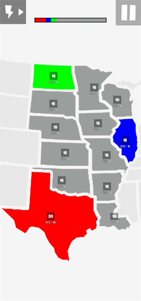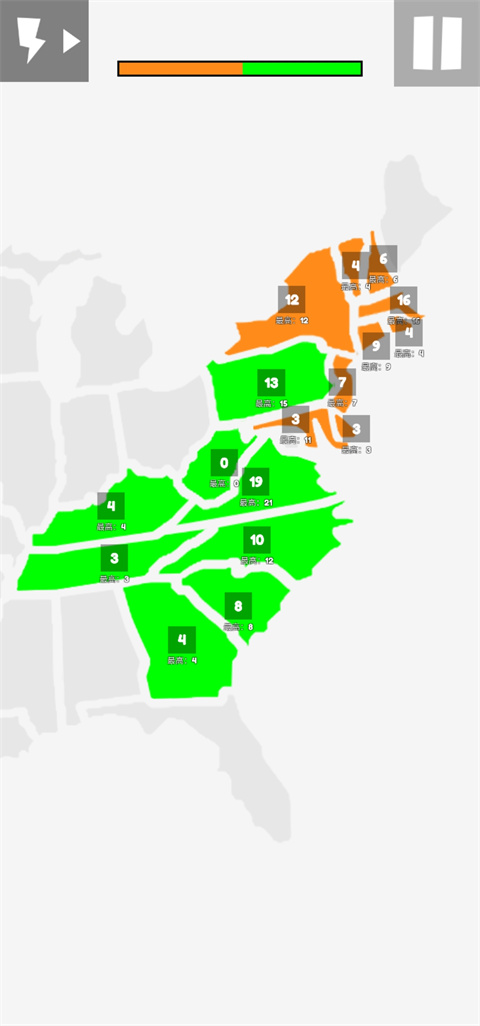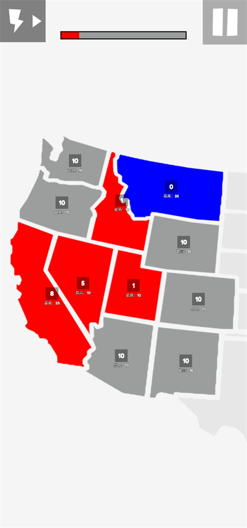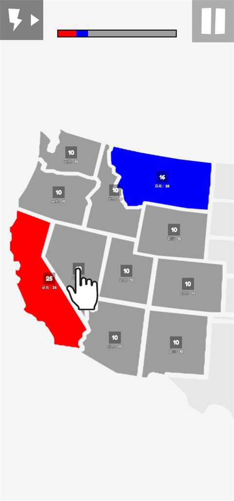 如果你想在地图上推演战争,亦或是想赢得美国大选到欧洲争霸,那么不妨来试试地图战争,这是一款超级好玩的战争策略手游,游戏已支持中文,并且在前作的基础上增加多个地图和关卡,为玩家带来更好的游戏体验感。地图战争手游中文版玩法简单,起始玩家有25个点数,需要利用自己的点数将灰色地区进行占领,比如灰色地区有10个点数,这里玩家就需要将25个点数匀出来进行占领,然后自己就变成15个,灰色地区也变成自己是地盘,占领成功之后它自己也会不断生产出相对应的点数,看每个地区的点数最高是多少,后续也会增长到这个点数,直到将对手的位置全部占领便可获得游戏的胜利。