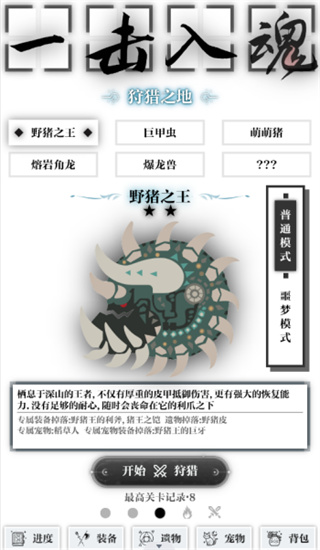 一击入魂游戏内玩家需要点击开始狩猎进入游戏,在这之前玩家需要先选择一个英雄,英雄会自动进行攻击,当英雄击败猎物即可通关,通关后玩家可以在4个奖励中选择一个来提升英雄,需要注意的是当玩家击败猎物还有机会获得特殊奖励,玩家需要在5个特殊奖励中选择其中一个来提升英雄,当玩家选择完毕玩家可以点击下一关继续进行狩猎,游戏中玩家被击败游戏就会结束,游戏会根据玩家游玩的情况来发放奖励。一击入魂游戏中的一切都充满了随机性,当然在闯关的过程当中还有非常多丰富的元素等待着玩家慢慢进行感受,每次的闯关都是一次技能的提升,也是对自己的考验。还在等什么,有兴趣的玩家快来下载游戏进行闯关吧!